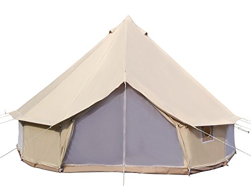 • Cover material: 0.63 lbs/10ft2 (285g/sqm) beige cotton canvas with 3000mm waterproof PU, tent with seam taped, mold resistant; Ground sheet material: 1.2 lbs/10ft2 (540g/sqm) PVC; the tent is waterproof on its own, it is alright to resist the light and moderate rain. Please use the cloth to cover the zipper closely, especially in rainy day, so the rain won’t leak in from zipper around the ground.