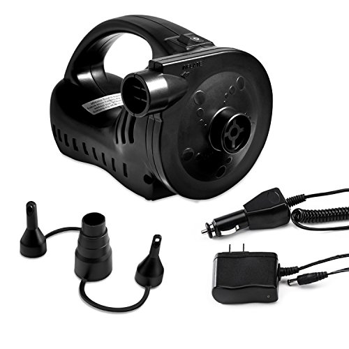 - RECHARGEABLE AND CORDLESS: AC and DC adapters included. AC air pump can be charged at home in a wall outlet, while the rechargeable air pump can be recharged in the car while you’re already out. A rechargeable battery plus cordless operation allows you to pack and have the air pump handy for camping trips, or quickly grab and go for spontaneous pool or beach outings. NOTE, the air pump will not turn on if either the red stopper or the AC/DC charger is plugged into the charging port