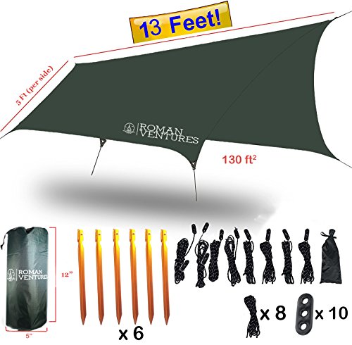 •LONGEST ON AMAZON: At 13 FEET Long And 10 FEET Wide our Rainfly offers up to 130 SQUARE FEET of Coverage! We use a Rectangular Design which gives you the most coverage. Don’t settle for diamond shaped designs (like Bear Butt) or small ones like ENO Profly. Roman Ventures Rainfly Is LARGER than the 10′ Chill Gorilla by 30% And LARGER than ENO ProFly by 196% (130 Ft^2 vs 66 Ft^2) AND ENO Profly doesn’t include stakes. Why settle for less? Get The Best!