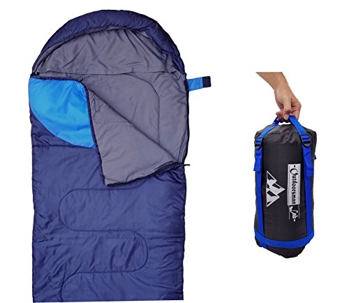 Features: Adopts water-resistant, breathable and crease-proof fabric. Uniue built-in pillow case let you stuff your towel or cloth into a comfortable pillow. Stop rolling off sleeping pad with 2 elastic straps on the backside. Pair perfectly w/ OutdoorsmanLab Sleeping Pads. Double-sided zipper with plastic handle, easy to use. No more snagged zipper with our full anti-sang layers on both side of the zipper. Extra inner pocket inside the sleeping bag for all your personal belongings. Unfold the sleeping bag to use it as a blanket. Make it a double sleeping bag by connecting two sleeping bags (one of each color variation) together. A 4-compression-strap bag included for maximum compact and portability. Specifications: Survival rating: 0C / 32F, Comfort At 7C / 45F and above, add an extra fleece to add 10 to 15F. Perfect for Cool weather/temperature trip. Fabric: 190T Polyester Lining: 210T Polyester Size: 215 x 82.5 cm / 85 x 32.5 inch Package Size: 7 x 15 in Weight: 3.3 lb / 1.45 kg Color: Dark Blue/Light Blue Note: 1. Product color in the pictures may vary slightly due to the color calibration of each individual monitor setting, please refer to the real item you receive. Note: 2. Hand wash only and no tumble Dry to avoid filling being tangledPackage List: 1 x Sleeping Bag 1 x Compression Stuff Sack.