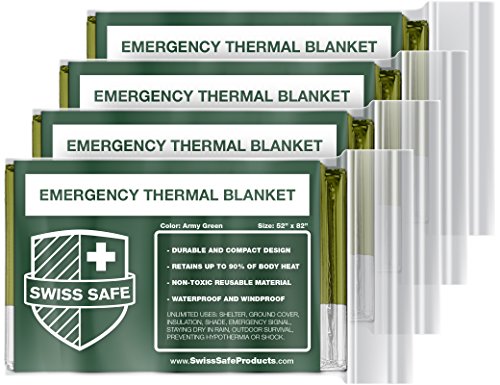 Swiss Safe Emergency Mylar Thermal Blankets (4-Pack) + Bonus Signature Gold Foil Space Blanket: Designed NASA – Perfect Outdoors, Hiking, Survival, Marathons First Aid